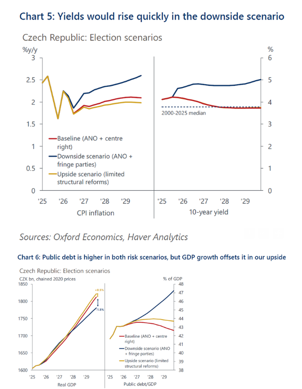 The negative scenario assumes that Babiš's movement will form a government majority with “fringe parties” (the Stačilo movement, the SPD, and possibly the Motorists). According to Oxford Economics, this would trigger a negative reaction from the markets: fears of waste, higher inflation, and a weakening of institutional quality.