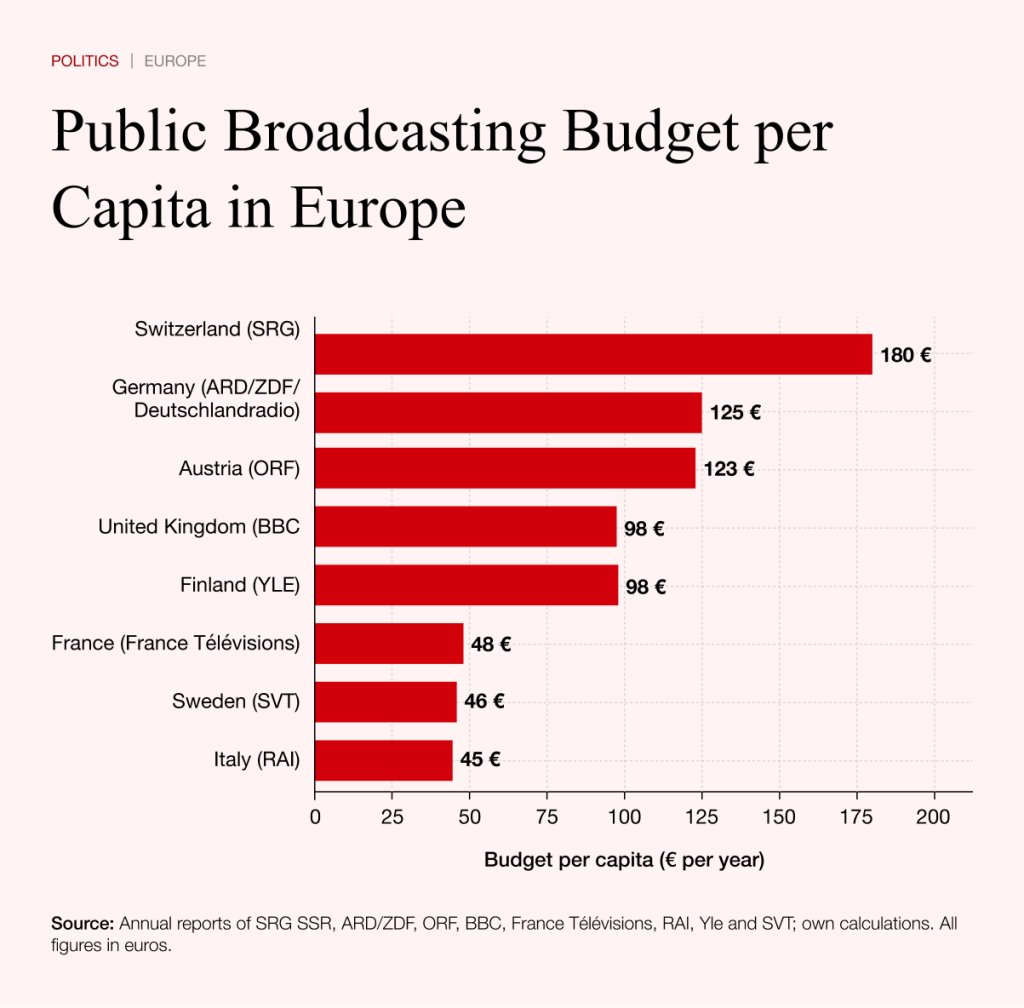The proposal would have affected above all SRG SSR, Switzerland’s largest media company. SRG operates several television channels, 17 radio stations and extensive online services and employs around 7,000 people. Its annual operating revenue stands at roughly €1.63 billion. With a population of about 9.05 million, that equals around €180 per person – one of the highest per-capita levels of public broadcasting funding in Europe. In Switzerland, the system has been the subject of political debate for years because public broadcasting occupies a dominant position in the media market.