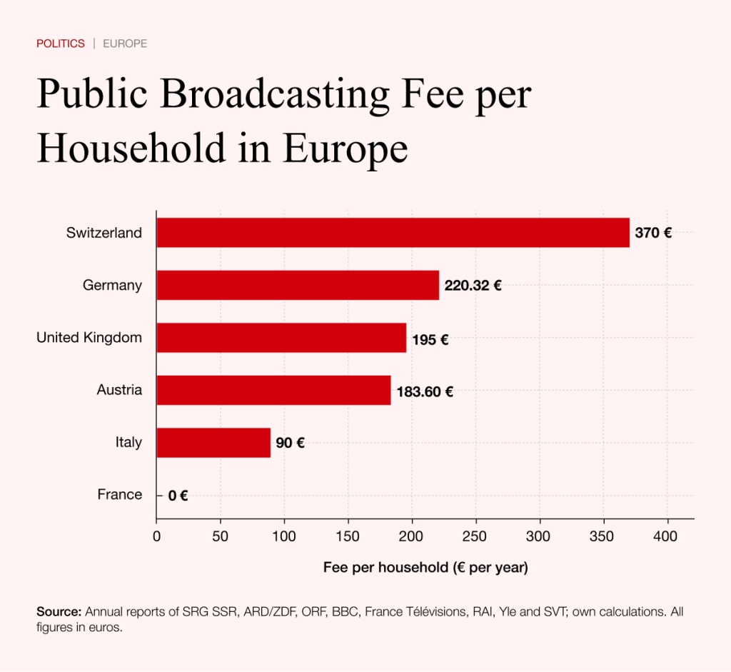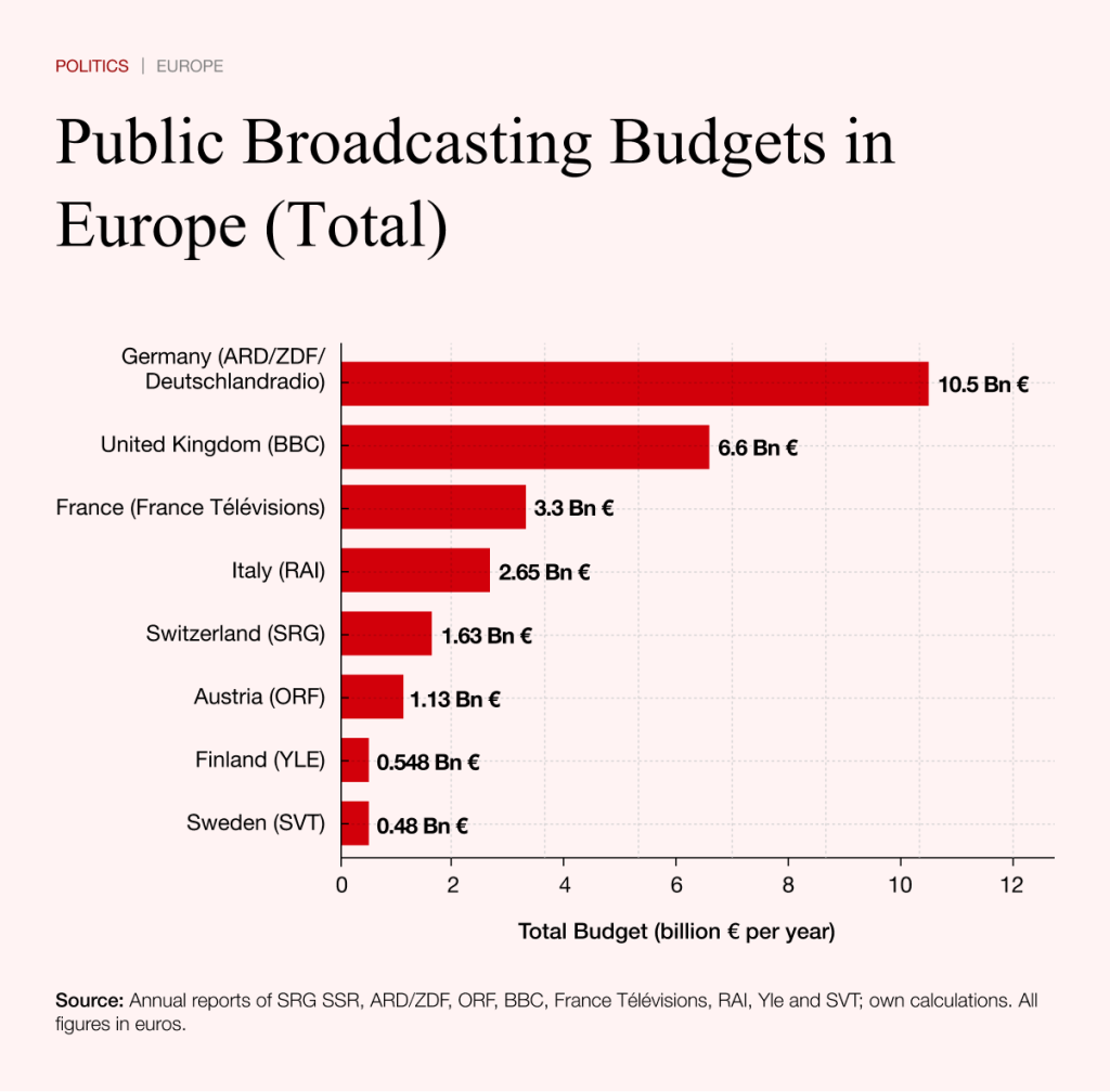 The European comparison shows that public broadcasting can take very different forms. In Switzerland and Germany, the systems are large and financed through licence fees with substantial budgets. France funds broadcasting through taxation, while the United Kingdom maintains a traditional licence system with an opt-out. Italy, meanwhile, has linked its licence fee to electricity bills.