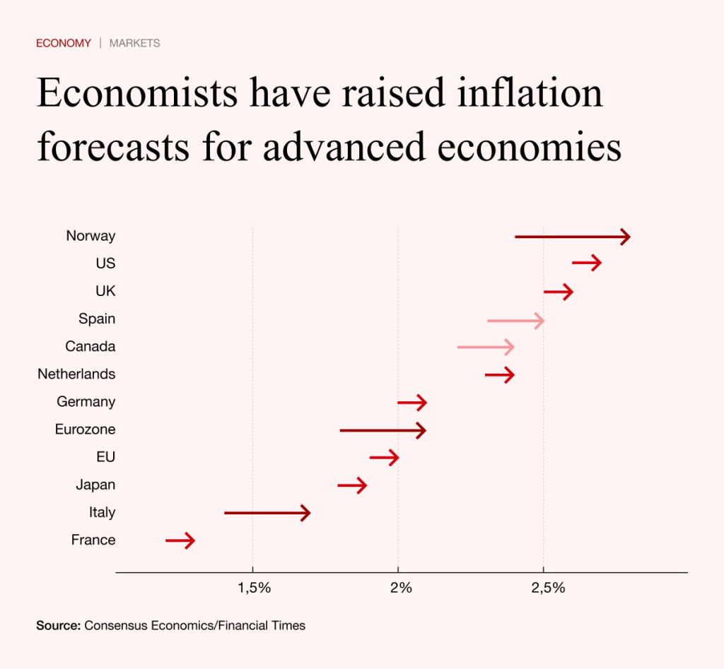 Oxford Economics has raised its forecast for global food price growth from below one per cent to around two per cent. Martin Hudcovský of the Slovak Academy of Sciences has suggested a similar magnitude. A sustained 10 per cent rise in energy prices could translate into a roughly 2.5 per cent increase in food prices over time.