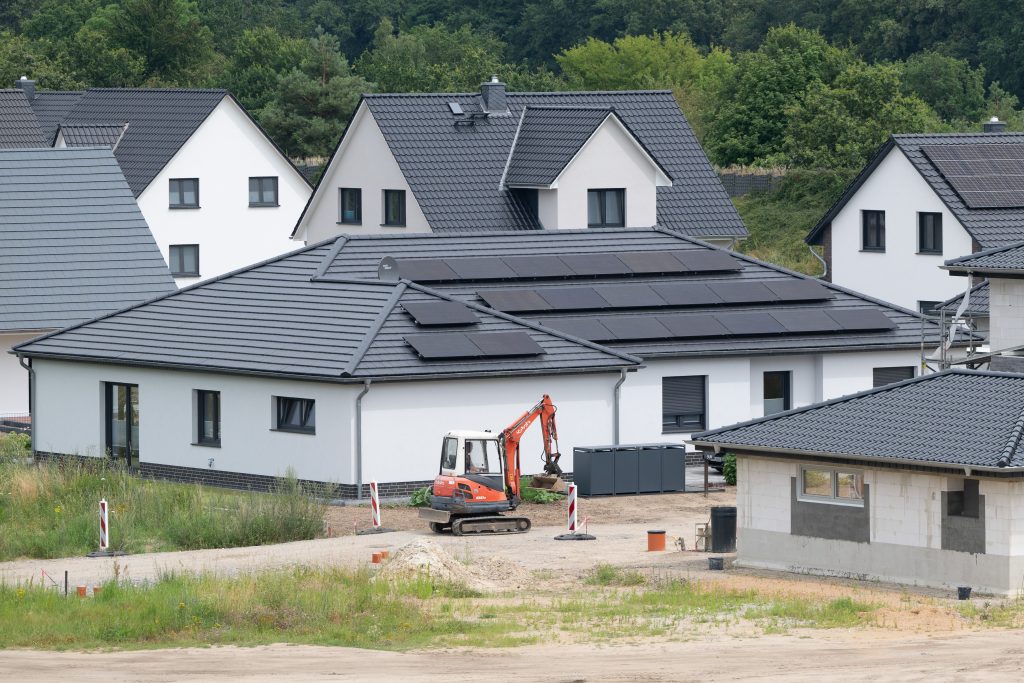 A mini excavator drives past newly built houses in Germany. The government wants to decide who is allowed to live there. Photo: Sebastian Christoph Gollnow/dpa via Getty Images