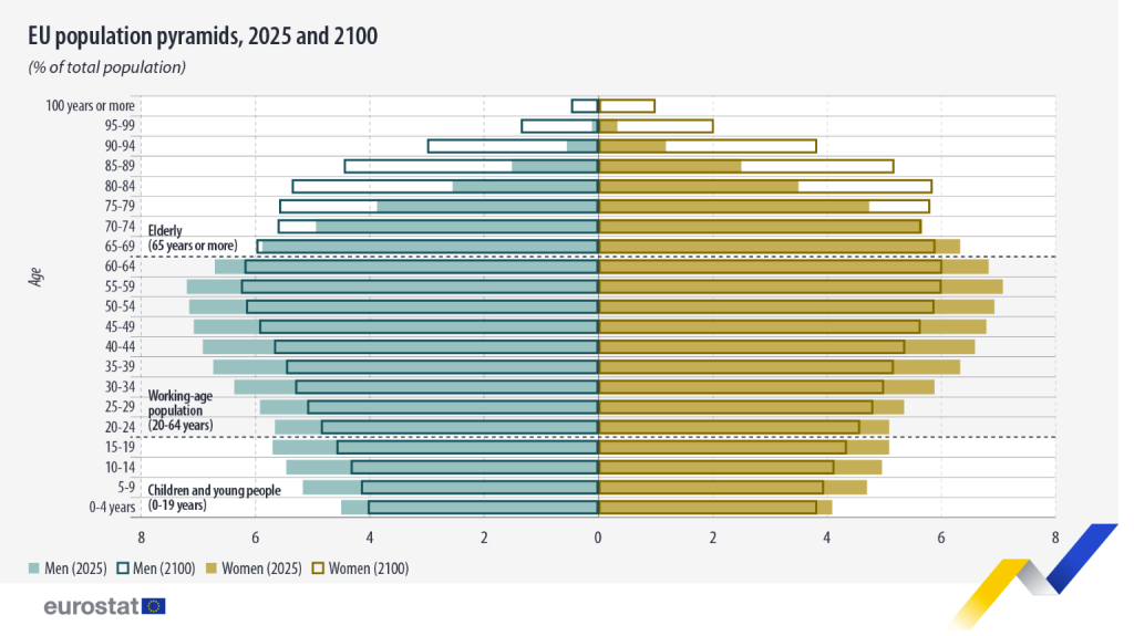 The EU population pyramid shifts from a broad working-age base in 2025 to a top-heavy structure by 2100, reflecting rapid ageing and a shrinking younger population. Source: Eurostat